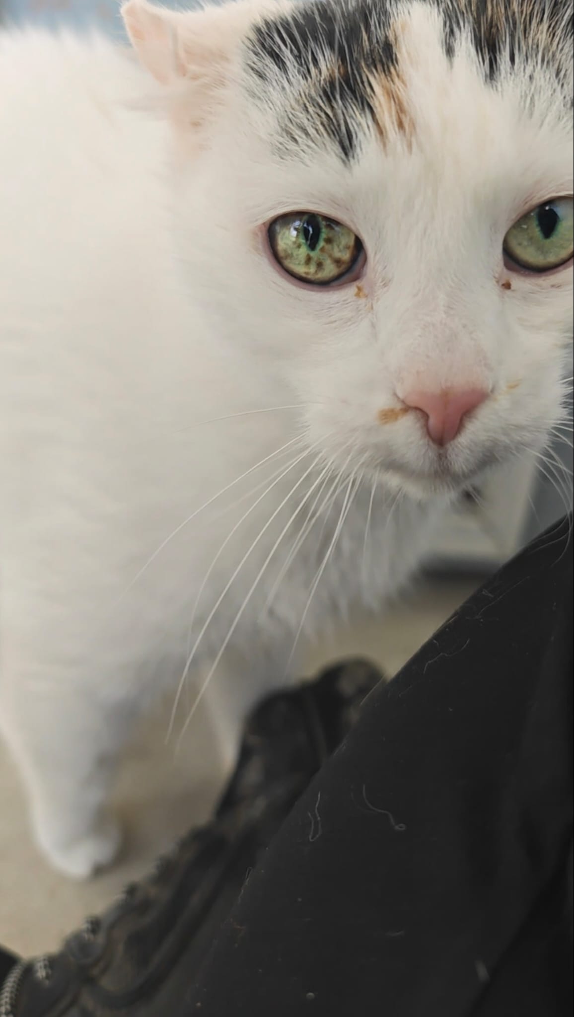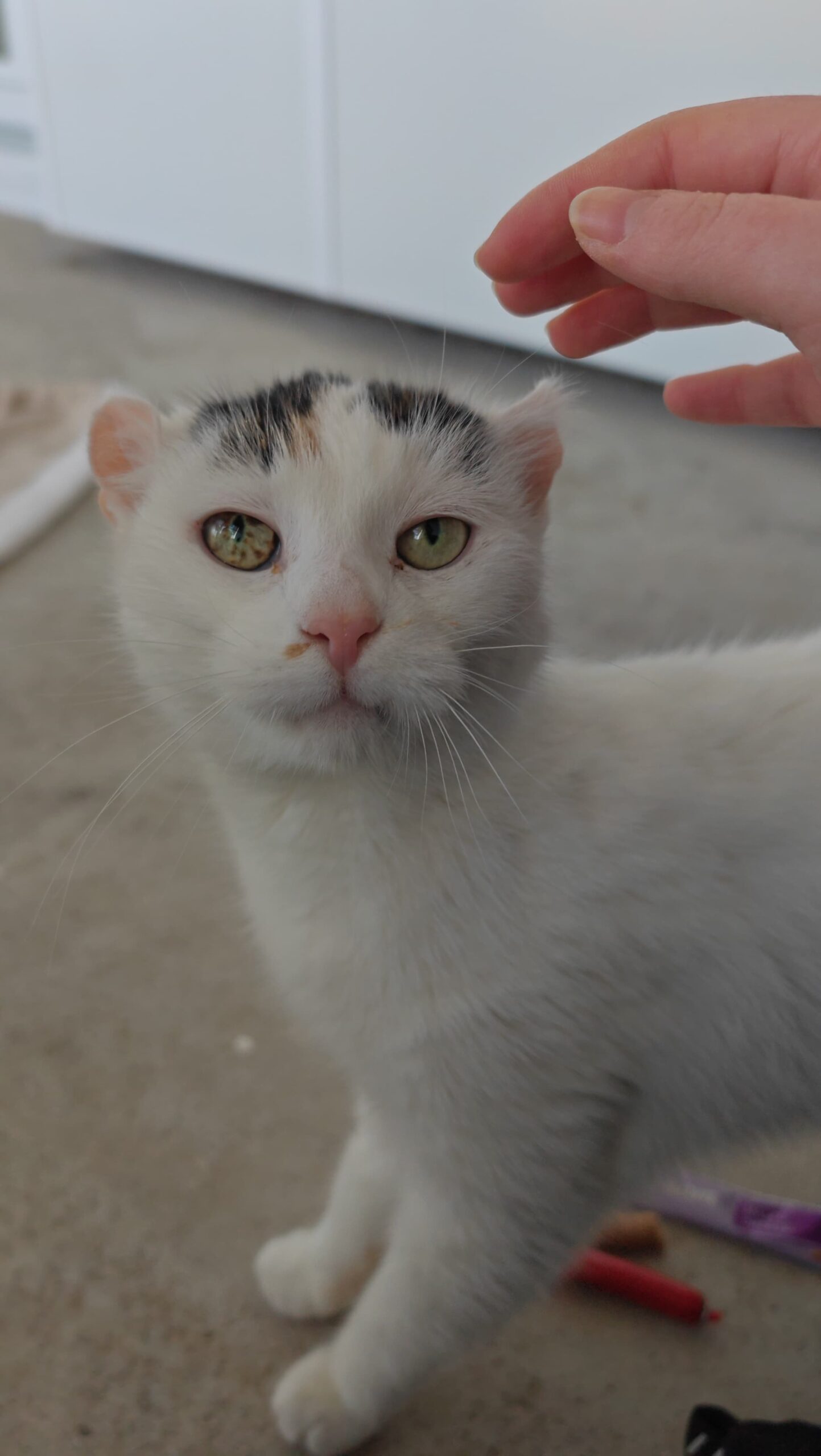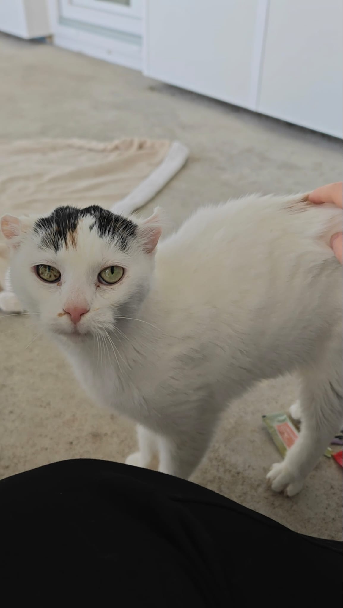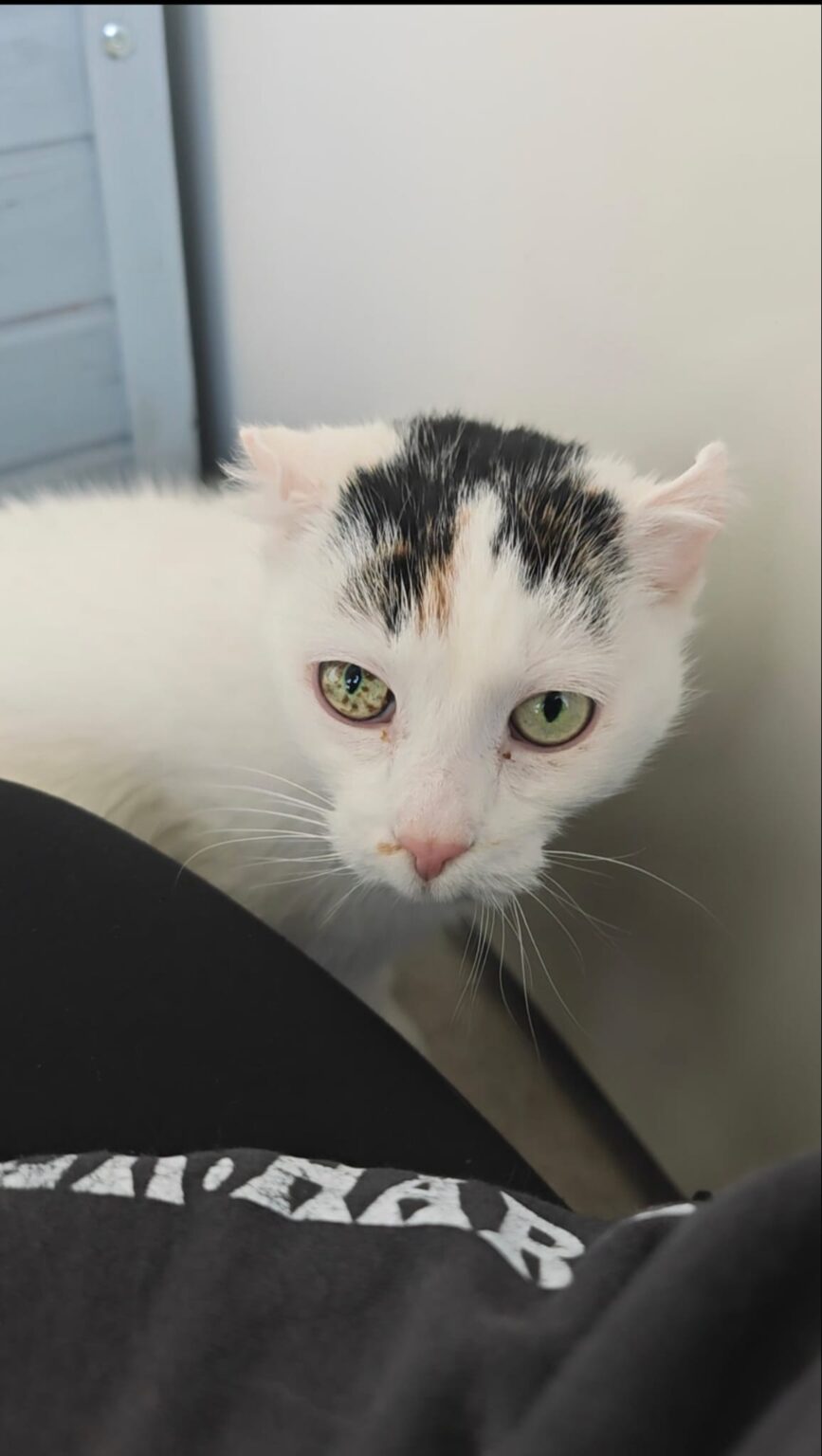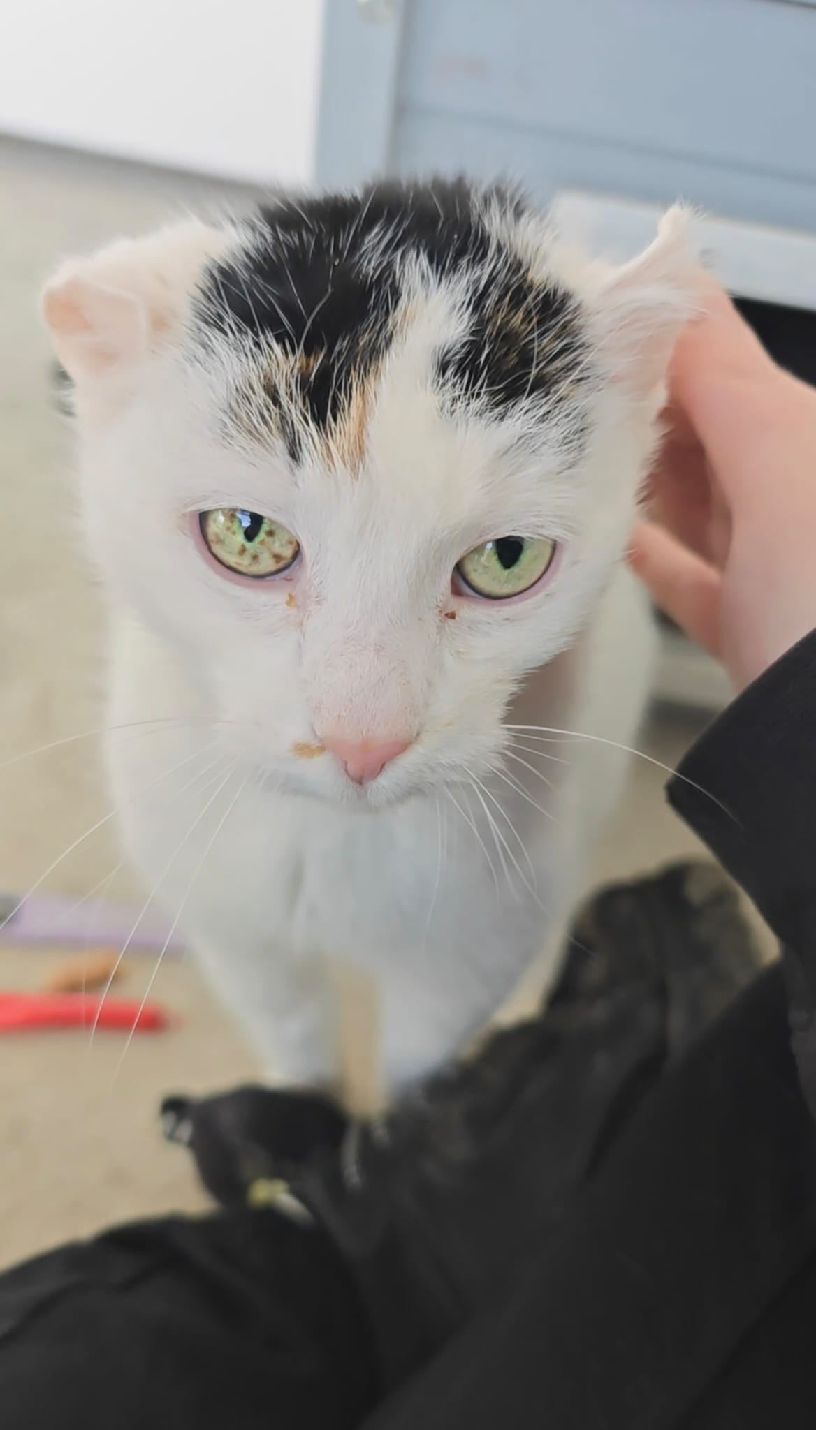 Azura wird auf 10 Jahre oder älter geschätzt und trägt ein ganz besonderes Merkmal: ihre sogenannten „Blumenkohlohren“. Diese verkrüppelten Ohren entstehen meist durch heftiges Kratzen bei starkem Juckreiz, zum Beispiel durch unbehandelte Ohrmilben oder ständige Ohrenentzündungen. Für Azzura bedeutet das heute glücklicherweise keine gesundheitlichen Einschränkungen – es ist lediglich ein Schönheitsmakel, der sie aber unverwechselbar macht.