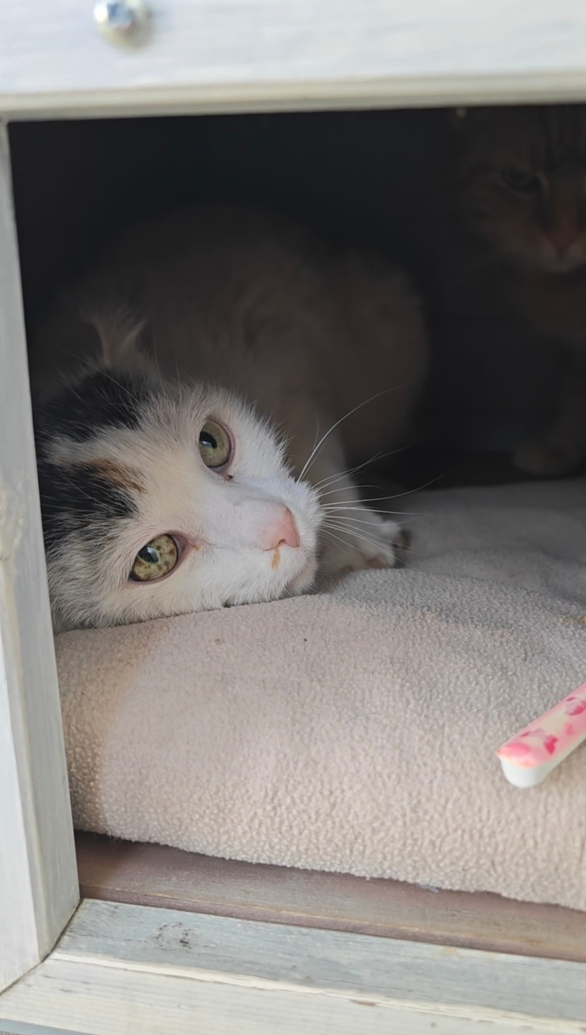 Azzura wurde zusammen mit Tassja bei uns ausgesetzt – ihre Geschichte hat viele Menschen berührt und die beiden Katzen sind bei uns zu kleinen Facebook-Celebrities geworden.
