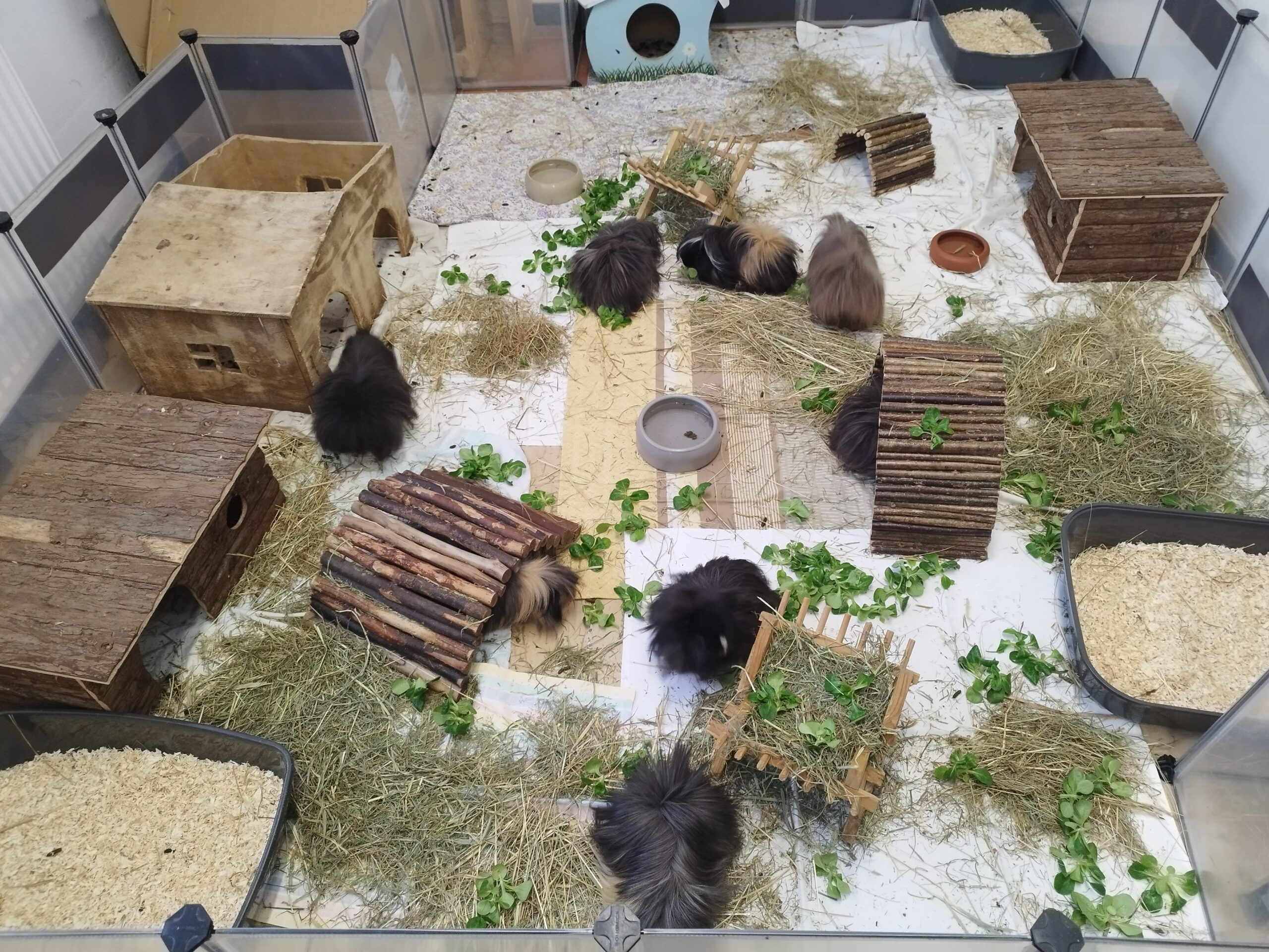 Unsere 11 Meerschweinchen – Böckchen leben derzeit gemeinsam in einer Gruppe und sind den Kontakt zu Artgenossen gewohnt. Typisch meerschweinchenhaft zeigen sie sich noch recht scheu und ziehen sich bei ungewohnten Situationen gern in ihre Verstecke zurück. Mit Ruhe, Geduld und liebevoller Zuwendung fassen sie jedoch nach und nach Vertrauen.